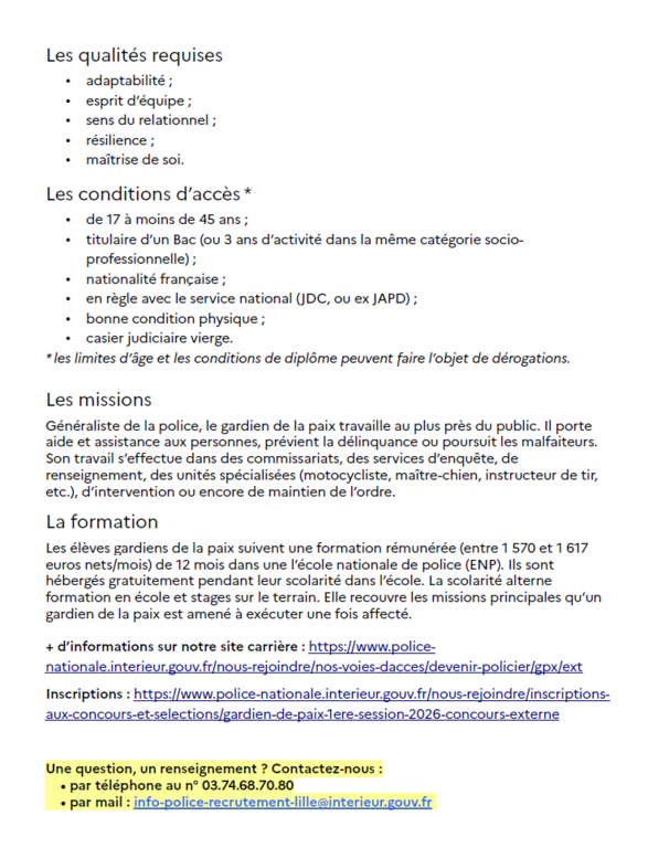 Info Police Recrutement Lille : Tél. 03.74.68.70.80 ou mail : info-police-recrutement-lille@interieur.gouv.f