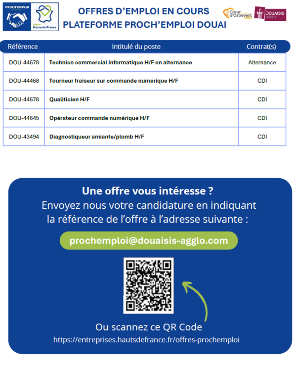 Envoyez-nous sa candidature à prochemploi@douaisis-agglo.com en précisant la référence de l’offre ou contactez-nous au 03 27 80 52 31.